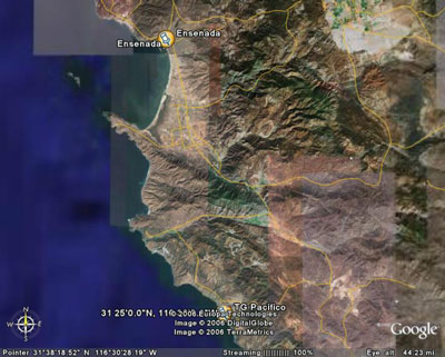 The complex, big enough to house 300 staff, will be known as the Centro Autónomo de Desarrollo Global (CADG) - Independent Centre for Global Development) - or 'TG Pacifico'. It is located at San Juan de las Pulgas ranch in remote countryside 50km south of the city of Ensenada, on the Pacific coast south of Tijuana (Click maps to enlarge) .